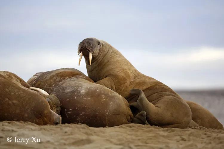 海象在我们的北极行程中几乎是不会缺席的一员。无论是在斯瓦尔巴或是格陵兰的海岸边或是海冰上,都可以发现它们慵懒地躺在一起。